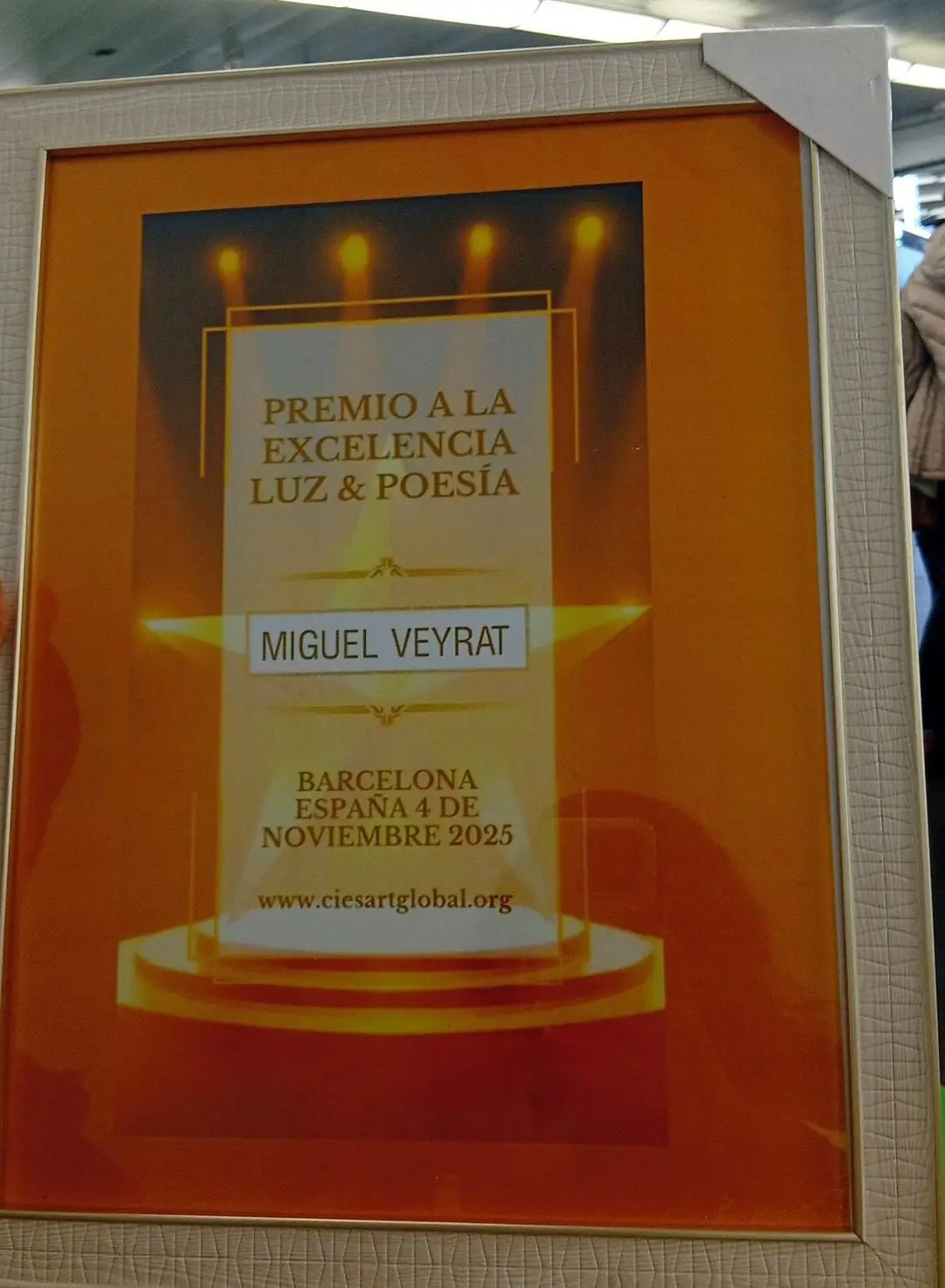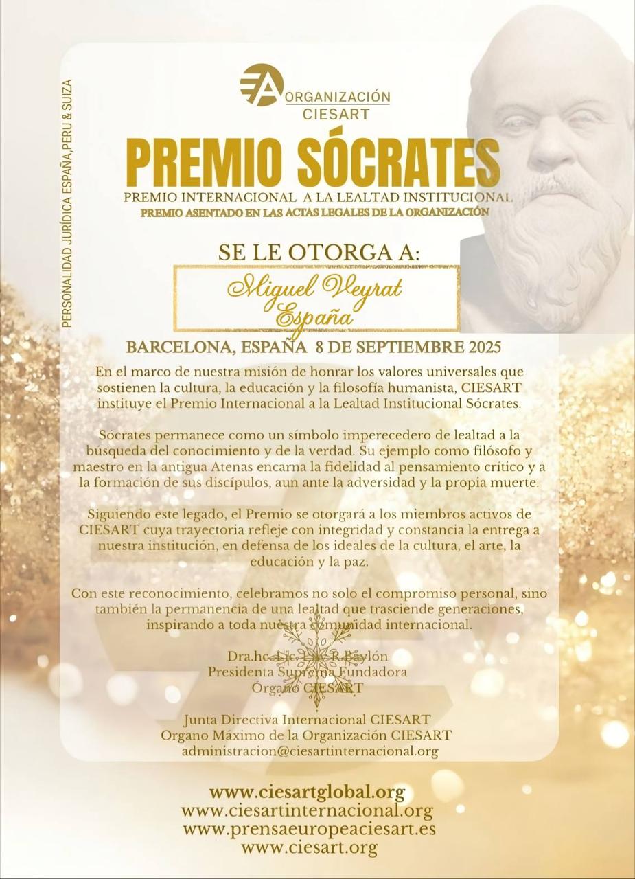 Premio a la Excelencia Luz y Poesía entregado por la presidenta de CIESART, Lily Baylon a Miguel Veyrat.